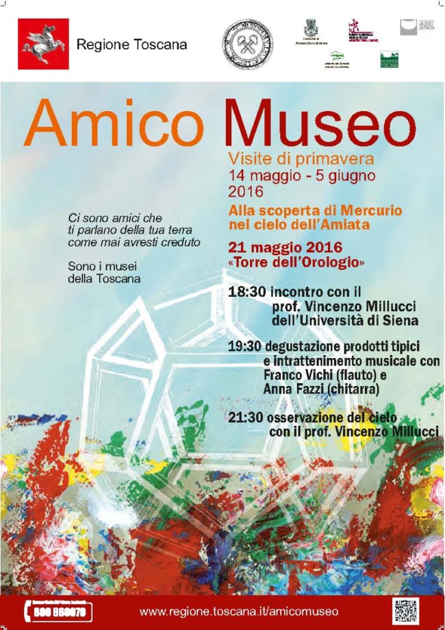 In occasione della Notte Europea dei Musei il Parco Museo Minerario di Abbadia San Salvatore Vi invita a partecipare all’evento “Alla scoperta di Mercurio nei cieli dell’Amiata” Sabato 21 Maggio ore 18.30 Incontro con il Prof. Vincenzo Millucci dell’Università di Siena che farà una breve introduzione alla serata astronomica ore 19.30 Degustazione di prodotti…