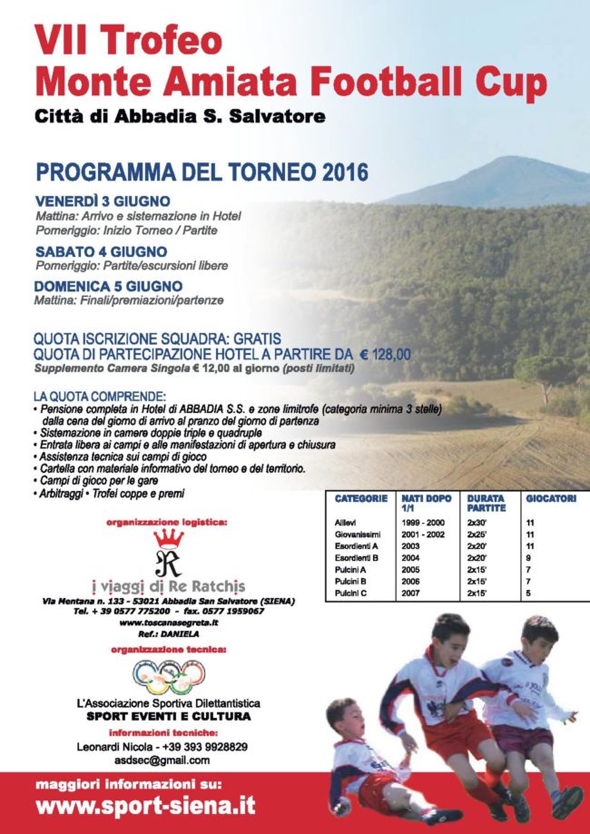 Amiata e dintorni Programma dal 17 al 23 Luglio 2016 Eventi Concerti Musei Visite guidate Musei e Parchi Abbadia San Salvatore Domenica 17 Luglio Ore 9.00 Stadio Comunale Partenza “Salitredici” – Corsa podistica da Abbadia San Salvatore alla Vetta del Monte Amiata Ore 16/18 Piazza del Mercato “Burraco in Piazza” Divertimento,…