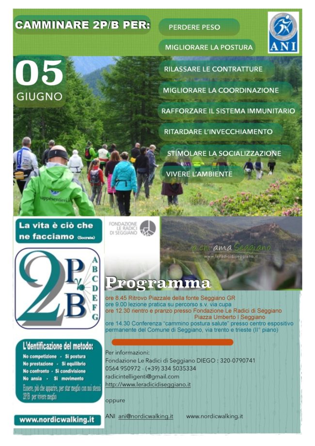 Domenica 5 Giugno prossimo, si terra’ a Seggiano la “CAMMINATA DELLA SALUTE”, promossa dall’ ANI (Associazione Italiana Nordic Walking) in collaborazione con la Fondazione Le Radici di Seggiano. Gli istruttori qualificati dell’ Associazione, illustreranno ed applicheranno la metodica 2P/B, tecnica basata sullo studio della camminata biomeccanicamente corretta che apporta benefici a tutto il corpo. Il ritrovo…