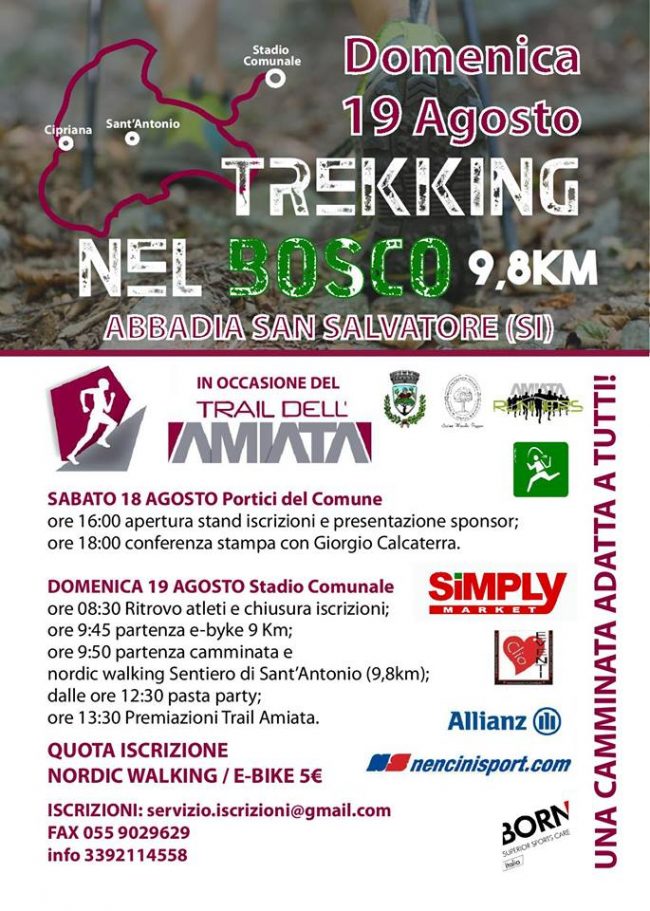 Trail dell'Amiata 2018: 19 Agosto 19 AGOSTO 2018 – Stadio Comunale Abbadia San Salvatore ISCRIZIONI mail servizio.iscrizioni@gmail.com fax 055 9029629 Regolamento Per partecipare alla gara è indispensabile aver compiuto il 18° anno di età al momento della iscrizione. Condividere e rispettare l’etica esposta al punto precedente. Per la gara vige la regola della semi auto-sufficienza, in…