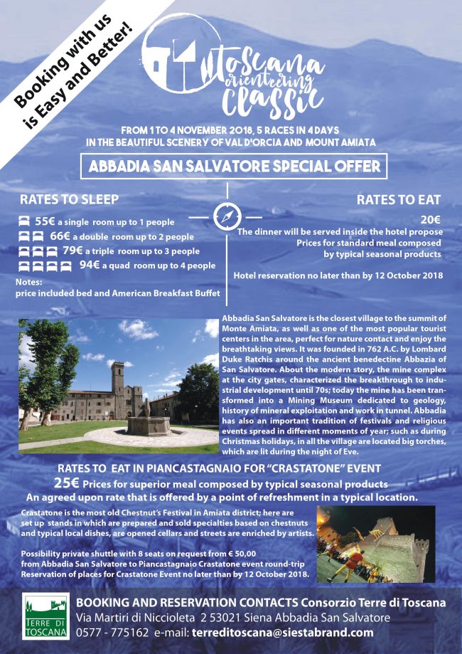 IKP vi presenta l’evento Toscana Orienteering Classic 2018. Appuntamento dal 1 al 4 Novembre 2018, 5 gare in 4 giorni nello splendido scenario della Val D’Orcia e dell’Amiata. Ecco le nostre proposte per il soggiorno: Programma 01.11 Middle – Bosco – Abbadia San Salvatore 02.11 Middle – Bosco – Abbadia San Salvatore 02.11 Night Sprint…